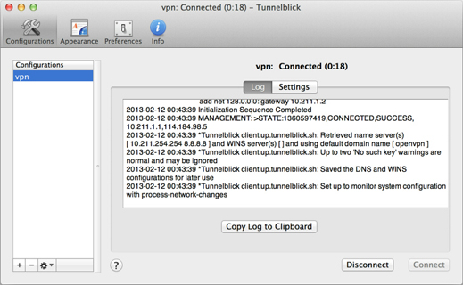 上述步骤导入 OpenVPN 连接设置文件 (.ovpn 文件) 至 Tunnelblick 里。